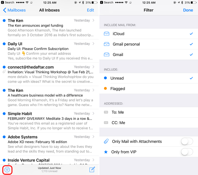 - Bước 1: Chạm vào nút Lọc email ở góc dưới cùng bên trái của danh sách hộp thư.