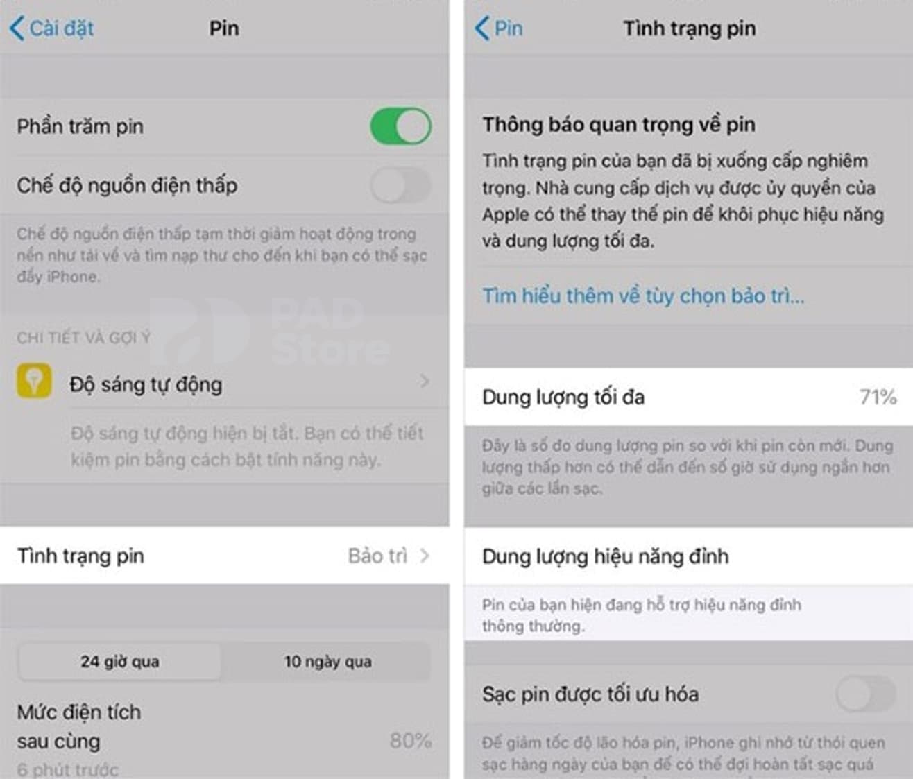 Vào cài đặt – vào mục Pin – mục tình trạng pin – dung lượng tối đa. Nếu máy đã hiện bảo trì thì bạn nên thay pin để không ảnh hưởng đến quá trình sử dụng.