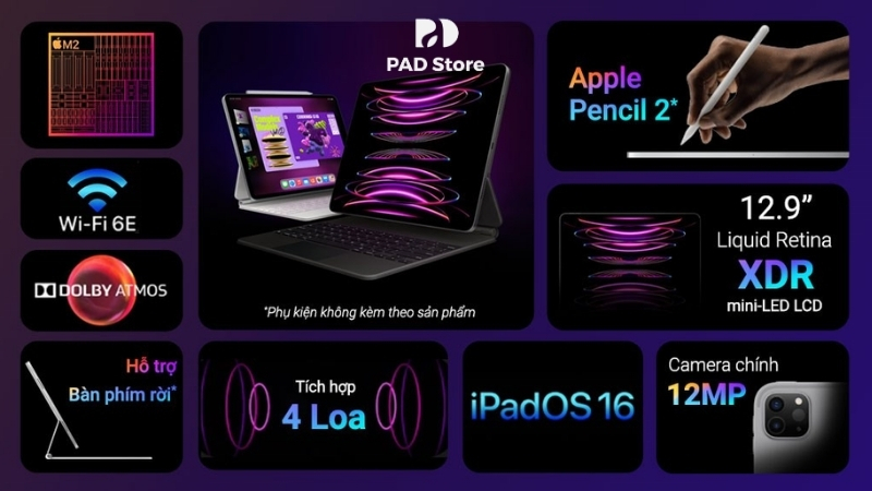 • iPad Pro M2: Hệ thống âm thanh 4 loa, âm thanh Dolby Atmos, micro chất lượng cao.